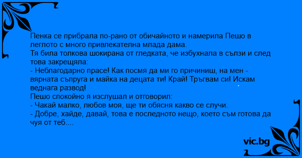 - Скъпа, Пени, тъкмо се качвах в колата, за да тръгна за вкъщи, и една млада жена ме помоли да я откарам. Изглеждаше толкова беззащитна и нещастна, че я съжалих. По пътя забелязах колко е слаба, мръсна, зле облечена. Освен това, както тя каза, три дни не била яла нищо. От огромно състрадание, аз я доведох у нас, направих и горещ шоколад, който ти отказа, защото си на диета, а това бедно момиче изпи една голяма чаша. Тя беше мръсна и нищо чудно, че и предложих да се изкъпе. Докато беше под душа, видях дрехите и, че са с дупки и ги хвърлих в боклука.