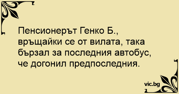 Пенсионерът Генко Б., връщайки се от вилата, така бързал за последния автобус, че догонил предпоследния.
