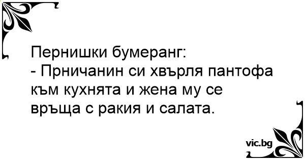 - Прничанин си хвърля пантофа към кухнята и жена му се връща с ракия и салата.