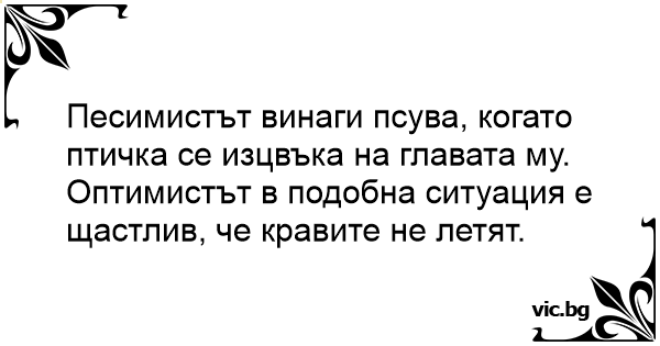 Песимистът винаги псува, когато птичка се изцвъка на главата му.