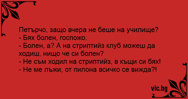 Петърчо, защо вчера не беше на училище? - Бях болен, госпожо. - Болен, а? А на стриптийз клуб можеш да ходиш, нищо че си болен? - Не съм ходил на стриптийз, в къщи си бях! - Не ме лъжи, от пилона всичко се вижда?!