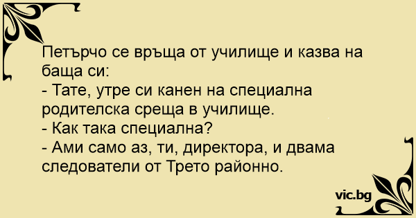 Петърчо се връща от училище и казва на баща си:
