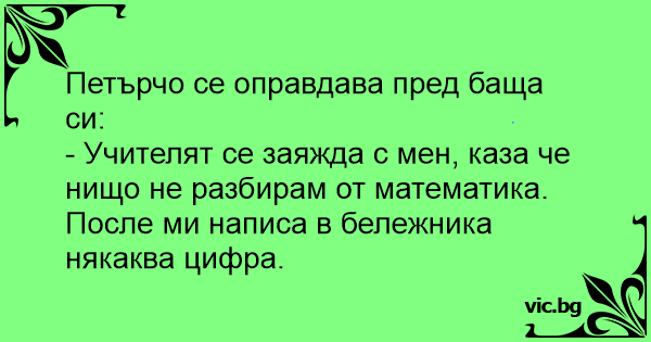 - Учителят се заяжда с мен, каза че нищо не разбирам от математика. После ми написа в бележника някаква цифра.