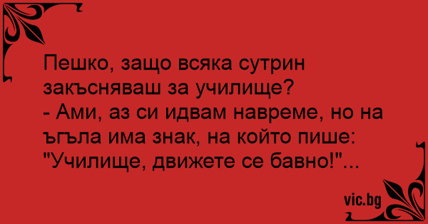 - Ами, аз си идвам навреме, но на ъгъла има знак, на който пише: "Училище, движете се бавно!"...