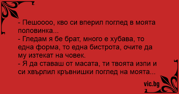 - Пешоооо, кво си вперил поглед в моята половинка...