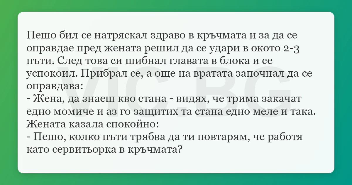 Пешо бил се натряскал здраво в кръчмата и за да се оправдае пред жената решил да се удари в окото 2-3 пъти. След това си шибнал главата в блока и се успокоил. Прибрал се, а още на вратата започнал да се оправдава: - Жена, да знаеш кво стана - видях, че трима закачат едно момиче и аз го защитих та стана едно меле и така. Жената казала спокойно: - Пешо, колко пъти трябва да ти повтарям, че работя като сервитьорка в кръчмата?