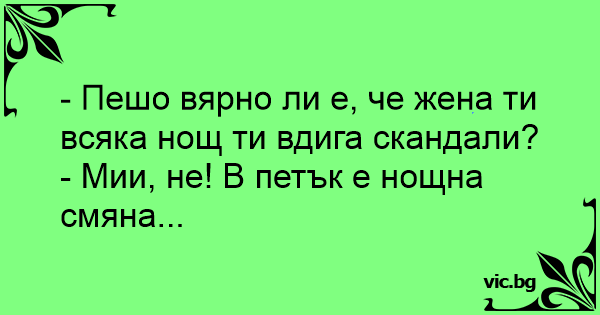 - Пешо вярно ли е, че жена ти всяка нощ ти вдига скандали?