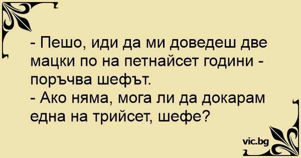 - Пешо, иди да ми доведеш две мацки по на петнайсет години - поръчва шефът.