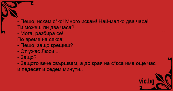 - Пешо, искам cekc! Много искам! Най-малко два часа! Ти можеш ли два часа?