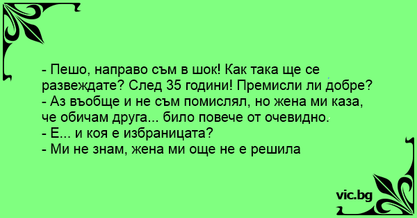 - Пешо, направо съм в шок! Как така ще се развеждате? След 35 години! Премисли ли добре?