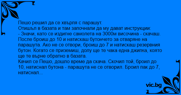 Качил се Пешо, дошло време да скача. Скочил той, броил до 10, натиснал бутона - парашута не се отворил. Броил пак до 7, натиснал резервния бутон - парашута пак не се отворил. Тогава си казал на глас: