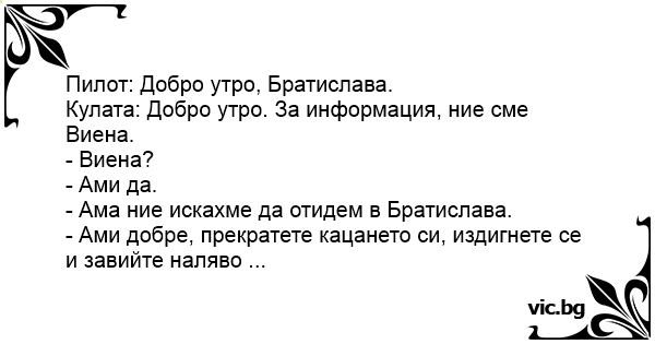 Pilot: Dzień dobry Bratysławo. Wieza: Dzień dobry. Dla informacji - mówi Wiedeń. Pilot: Wiedeń? Wieza: Tak. Pilot: Ale dlaczego, my chcieliśmy do Bratysławy. Wieza: OK w takim razie przerwijcie...