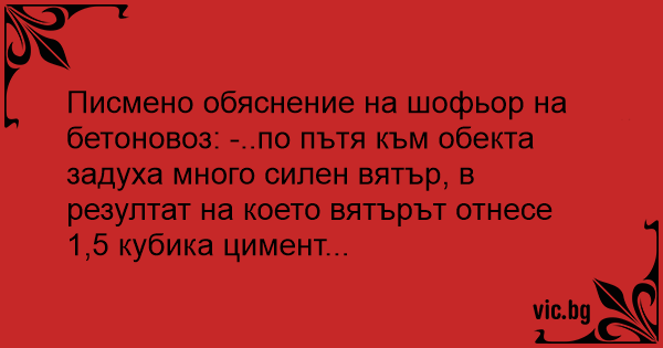 Писмено обяснение на шофьор на бетоновоз: -..по пътя към обекта задуха много силен вятър, в резултат на което вятърът отнесе 1,5 кубика цимент...