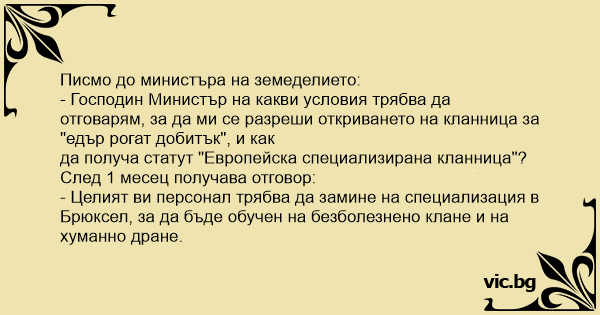 - Господин Министър на какви условия трябва да отговарям, за да ми се разреши откриването на кланница за "едър рогат добитък", и как