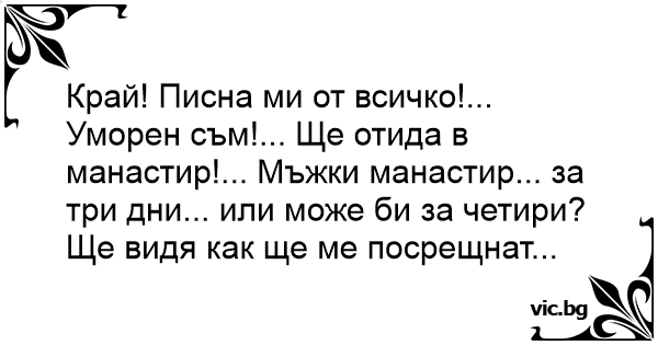 Край! Писна ми от всичко!... Уморен съм!... Ще отида в манастир!... Мъжки манастир... за три дни... или може би за четири? Ще видя как ще ме посрещнат...
