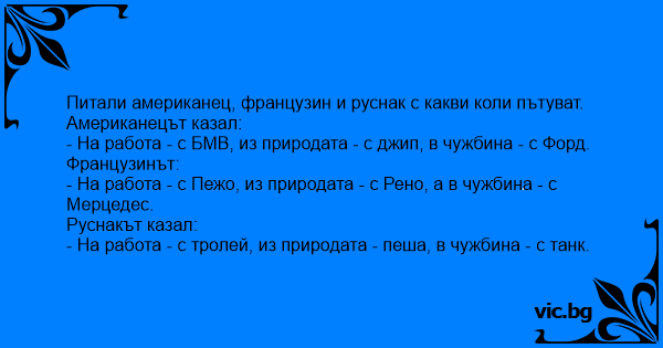 Питали американец, французин и руснак с какви коли пътуват. Американецът казал: - На работа - с БМВ, из природата - с джип, в чужбина - с Форд. Французинът: - На работа - с Пежо, из природата - с Рено, а в чужбина - с Мерцедес. Руснакът казал: - На работа - с тролей, из природата - пеша, в чужбина - с танк.