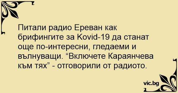 Питали радио Ереван как брифингите за Kovid-19 да станат още по-интересни, гледаеми и вълнуващи. “Включете Караянчева към тях” - отговорили от радиото.