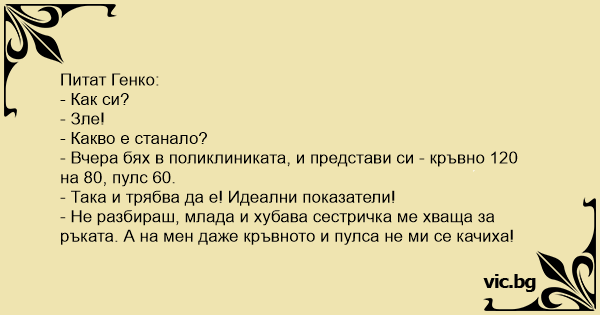 - Вчера бях в поликлиниката, и представи си - кръвно 120 на 80, пулс 60.