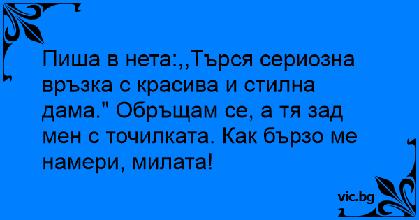 Пиша в нета:,,Търся сериозна връзка с красива и стилна дама." Обръщам се, а тя зад мен с точилката. Как бързо ме намери, милата!