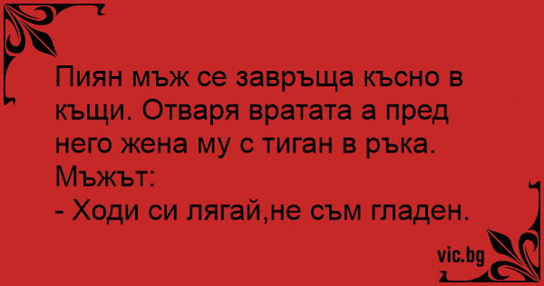 Пиян мъж се завръща късно в къщи. Отваря вратата а пред него жена му с тиган в ръка. Мъжът: