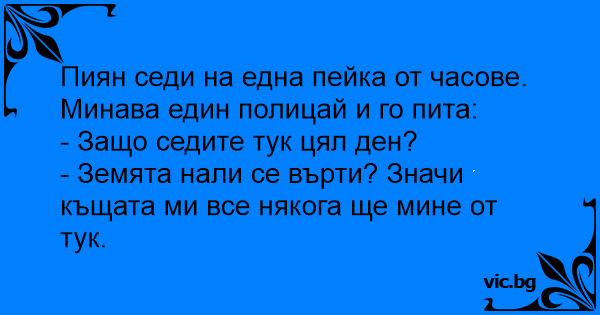 Пиян седи на една пейка от часове. Минава един полицай и го пита: