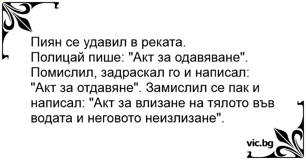 Полицай пише: "Акт за одавяване". Помислил, задраскал го и написал: "Акт за отдавяне". Замислил се пак и написал: "Акт за влизане на тялото във водата и неговото неизлизане".