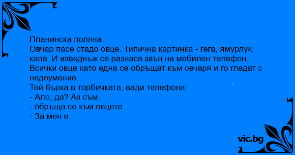 Овчар пасе стадо овце. Типична картинка - гега, ямурлук, капа. И изведнъж се разнася звън на мобилен телефон.