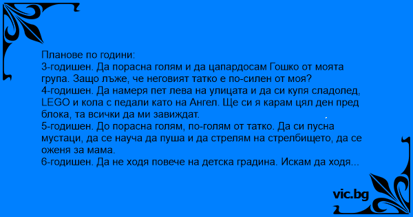 3-годишен. Да порасна голям и да цапардосам Гошко от моята група. Защо лъже, че неговият татко е по-силен от моя?