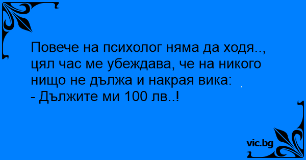 Повече на психолог няма да ходя.., цял час ме убеждава, че на никого нищо не дължа и накрая вика: - Дължите ми 100 лв..!