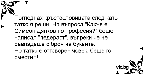 Погледнах кръстословицата след като татко я реши. На въпроса "Какъв е Симеон Дянков по професия?" беше написал "пeдepact", въпреки че не съвпадаше с броя на буквите.