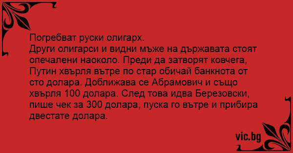 Други олигарси и видни мъже на държавата стоят опечалени наоколо. Преди да затворят ковчега, Путин хвърля вътре по стар обичай банкнота от сто долара. Доближава се Абрамович и също хвърля 100 долара. След това идва Березовски, пише чек за 300 долара, пуска го вътре и прибира двестате долара.