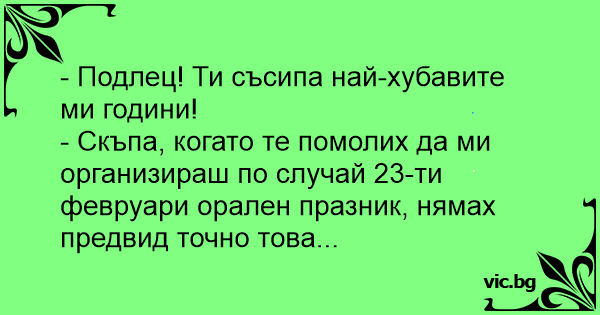 - Скъпа, когато те помолих да ми организираш по случай 23-ти февруари орален празник, нямах предвид точно това...