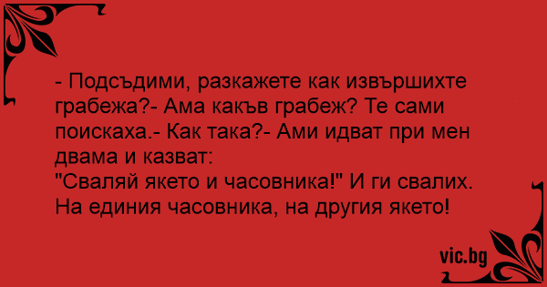 - Подсъдими, разкажете как извършихте грабежа?- Ама какъв грабеж? Те сами поискаха.- Как така?- Ами идват при мен двама и казват: