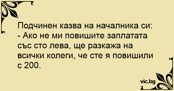 - Ако не ми повишите заплатата със сто лева, ще разкажа на всички колеги, че сте я повишили с 200.