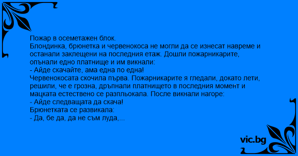 Блондинка, брюнетка и червенокоса не могли да се изнесат навреме и останали заклещени на последния етаж. Дошли пожарникарите, опънали едно платнище и им викнали: