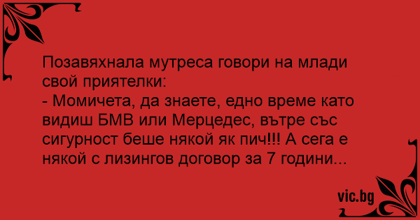 - Момичета, да знаете, едно време като видиш БМВ или Мерцедес, вътре със сигурност беше някой як пич!!! А сега е някой с лизингов договор за 7 години...