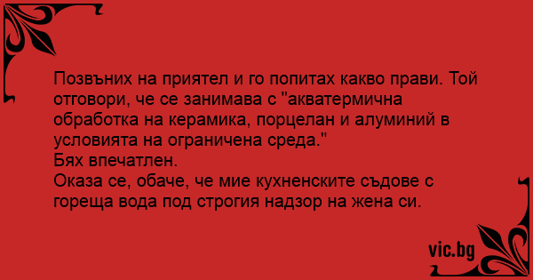 Позвъних на приятел и го попитах какво прави. Той отговори, че се занимава с "акватермична обработка на керамика, порцелан и алуминий в условията на ограничена среда."