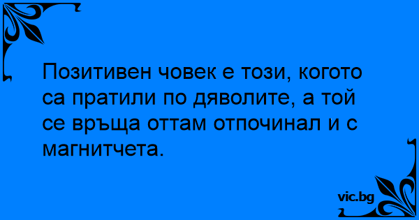 Позитивен човек е този, когото са пратили по дяволите, а той се връща оттам отпочинал и с магнитчета.