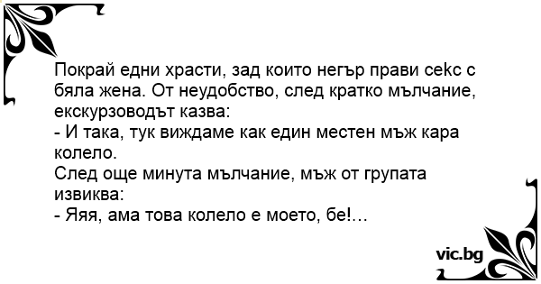 Покрай едни храсти, зад които нeгъp прави cekc с бяла жена. От неудобство, след кратко мълчание, екскурзоводът казва: