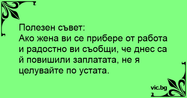 Ако жена ви се прибере от работа и радостно ви съобщи, че днес са й повишили заплатата, не я целувайте по устата.
