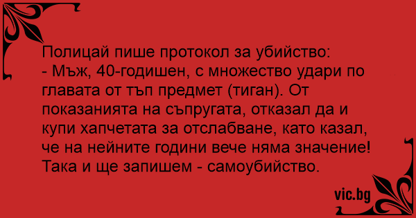 - Мъж, 40-годишен, с множество удари по главата от тъп предмет (тиган). От показанията на съпругата, отказал да и купи хапчетата за отслабване, като казал, че на нейните години вече няма значение! Така и ще запишем - самоубийство.