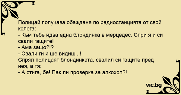 Uma loira com seu Porche passa por um radar a uma velocidade de 200 K/h e é parada por um guarda de trânsito. O policial gentilmente pede o documento do veículo e a loira responde: — O que é isso?!... Un poliziotto ferma una bionda che si sta’ facendo una strada a senso unico nel verso sbagliato. Poliziotto: “Ma si rende conto dove sta andando ?” Bionda: “no, ma dovunque sia, deve essere un... Poliisi pysäyttää blondin moottoritiellä Poliisi: Saisinko nähdä ajokortinne? Blondi: Mikä se on? Poliisi: Se on kortti, jossa on kuvanne. Blondi: Tässä. Poliisi: Ja sitten rekisteriote. Blondi:... Poliisi pysäyttää blondin moottoritiellä - Saisinko nähdä ajokorttinne? - Mikä se on? - Se on kortti, jossa on kuvanne. - Tässä. - Ja sitten rekisteriote. - Mikä se on? - Se on se paperi, jossa on... Sarışın yıldız adayı, üstü açık kırmızı arabasını gecenin bir vakti iyice tenhalaşmış ve loşlaşmış Hollywood Bulvarı'nda hızla sürerken trafik polisi çevirdi.. - "Hanımefendi, ehliyetiniz lütfen.."... Un poliziotto ferma un’auto per eccesso di velocita’. Fa segno di abbassare il finestrino e vede una fantastica bionda: “Patente, prego!”. Lei: “Patente? Cos’e’?”. Il poliziotto: “E’ quel documento... A policeman pulls a blonde in a sports car over for speeding and is trying to explain to her what and where her driver’s license might be. After she eventually gives him her driver’s license, he... Numa blitz o guarda para a bela loira e pede os documentos. — Que documentos? — pergunta ela, com ar inocente. — A sua Carteira de Habilitação! — Carteira de Habilitação? O que é isso? O guarda já... Polisen stoppar en blondin i en röd sportbil, går fram till henne, då hon vevar ner rutan. - Körkort? säger polisen. - Vad är det? undrar blondinen. - Ja, ditt bevis på att du har tillgång till att... Un gendarme arrête une blonde qui a fait un excès de vitesse: Le gendarme: – Bonjour Mlle, puis-je voir votre permis de conduire? La blonde: – Permis de conduire? Qu’est- Ce que c’est? Le gendarme:... Una loca jugaba corriendo en su silla de ruedas a lo largo del pasillo del manicomio imitando el ruido de un automóvil. De repente sale un loco de una habitación, la detiene y le dice: - Disculpe... Een dom blondje rijd op de weg. Er komt een politie auto langs haar rijden en zet haar aan de kant van de weg. “Wat is er aan de hand agent?” vraagt het domme blondje. Ondertussen haalt de agent... One day while on patrol, a police officer pulled over a car for speeding. He went up to the car and asked the driver to roll down her window. The first thing he noticed, besides the nice red sports... Polismannen stoppade en röd sportbil och gick fram till den för att be föraren om körkort och registreringsbevis. - Wow det var en riktigt läcker liten blondin det där, tänkte han. - Har du... Un gendarme arrête une blonde pour excès de vitesse. - Permis SVP ! - C'est quoi le permis ? - Papier rose ! - Ah ! Oui ! Tenez. - Assurance ! - C'est quoi l'assurance ? - Papier vert ! Le gendarme se gratte l'entre-jambe par hasard, après des heures de poste et la blonde s'écrit : - Ah ! Non... Ein Polizist stoppt eine blonde Frau, die einfach etwas zu schnell gefahren ist. Polizist: Полицай спира огромен Мерцедес, вътре красива блондинка: Αλκοτέστ H Ξανθιά με το κάμπριο... Wheelchair Driving Алкотест Um dia a loira estava dirigindo em alta velocidade e o guarda parou ele _Deixa eu ver sua carteira de motorista! — E eu sei la o que e isso seu guarda. — O IPVA do carro esta pago? — Eu tambem nao... Numa avenida movimentada na cidade de São João Nepomuceno interior de Minas, um guarda de trânsito (um negão de uns dois metros),pára uma loira que avançou o sinal; — Minha senhora, a carteira de... Policjant zatrzymuje blondynkę: - "Poproszę prawo jazdy!" - "A co to jest" - "To taki kartonik ze zdjęciem uprawniający do prowadzenia pojazdu" - "Aha, proszę bardzo" - "Poproszę jeszcze dowód... Miami ‘de üstü açık spor arabasıyla gezen sarışın afet’i trafik polisi durdurur. - Hanımefendi ehliyetinizi görebilirmiyim ? - Nedir o? - Hani araç kullanırken yanınızda taşımanız gereken...