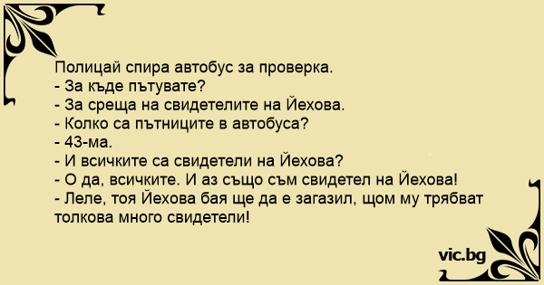 - Леле, тоя Йехова бая ще да е загазил, щом му трябват толкова много свидетели!