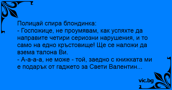 - Госпожице, не проумявам, как успяхте да направите четири сериозни нарушения, и то само на едно кръстовище! Ще се наложи да взема талона Ви.
