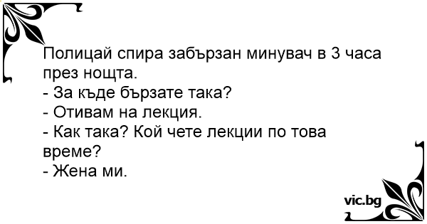 Пиян мъж върви по улицата. Среща го полицай: - Къде си тръгнал, не се ли виждаш колко си пиян?- пита последният. - На лекция за вредата от алкохола- отговаря пияният. - Каква лекция? Я, погледни, 3 през нощта е! Кой луд чете лекции по това време?! - Жената и тъщата...
