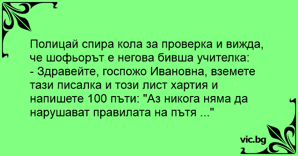 Полицай спира кола за проверка и вижда, че шофьорът е негова бивша учителка: