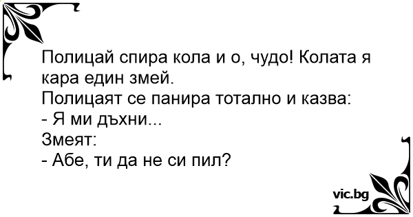 Полицаец запира кола и оп, чудо! Колата ја вози еден змеј. Полицаецот исплашено прашува: - Ајде дувни... Змејот: - Абе, ти да не си пиел???