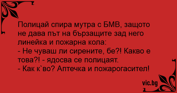 - Не чуваш ли сирените, бе?! Какво е това?! - ядосва се полицаят.