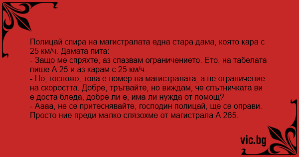 - Но, госпожо, това е номер на магистралата, а не ограничение на скоростта. Добре, тръгвайте, но виждам, че спътничката ви е доста бледа, добре ли е, има ли нужда от помощ?