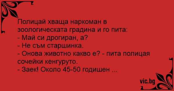 Полицай хваща наркоман в зоологическата градина и го пита: